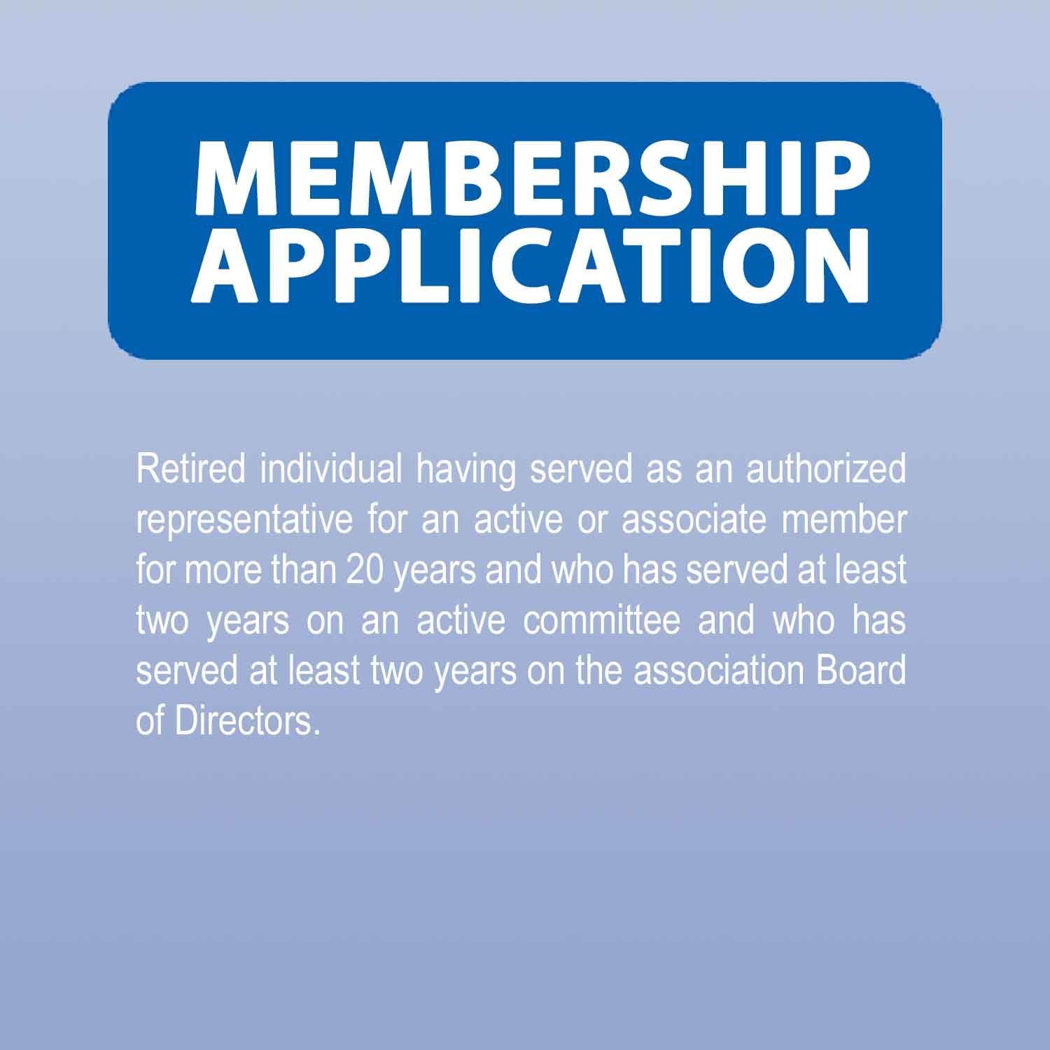 Retired individual having served as an authorized representative for an active or associate member for more than 20 years and who has served at least two years on an active committee and who has served at least two years on the association Board of Directors.